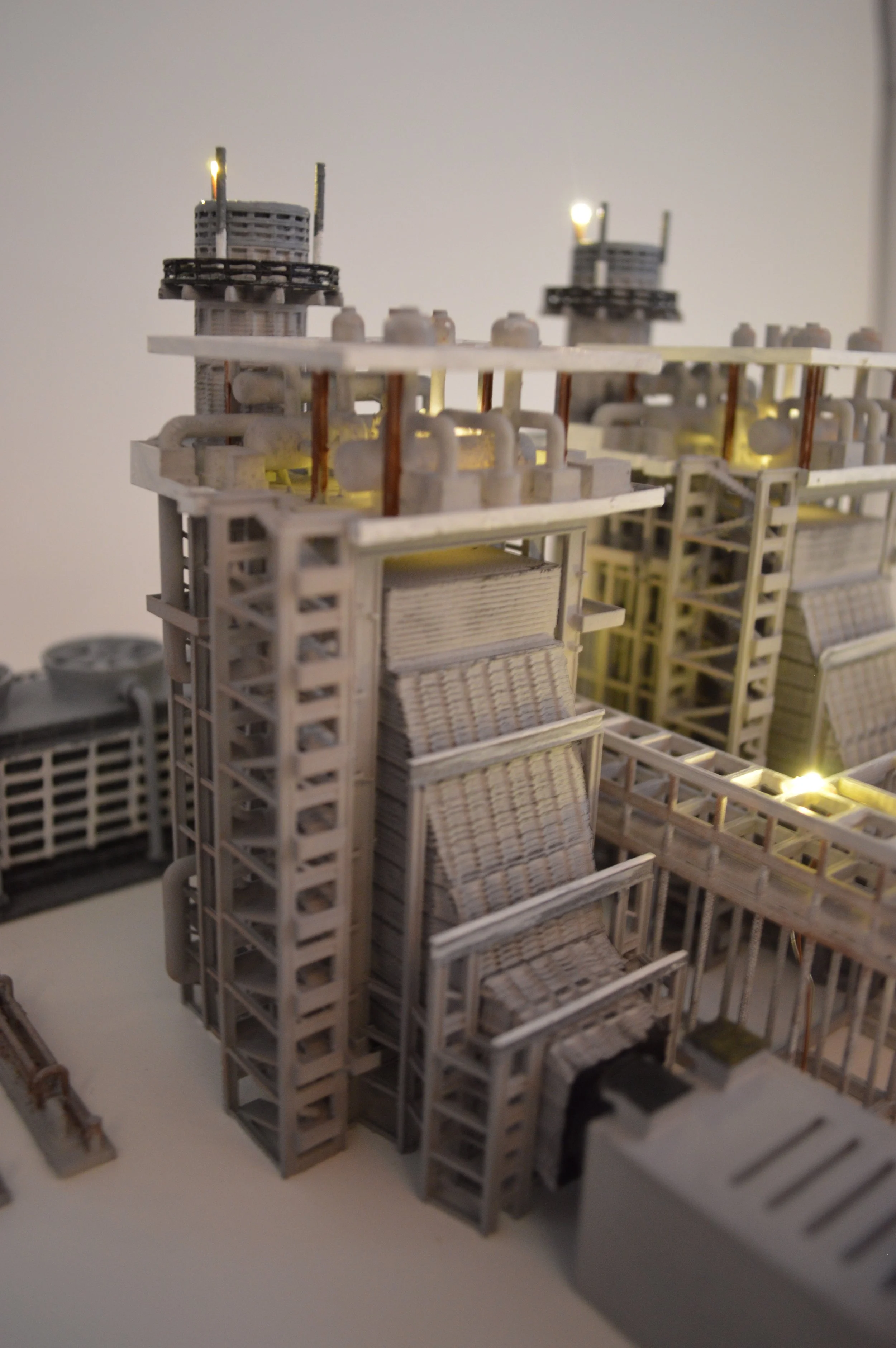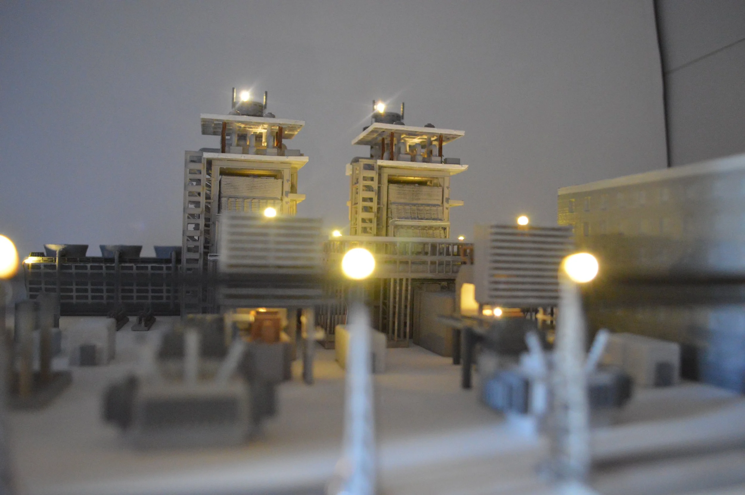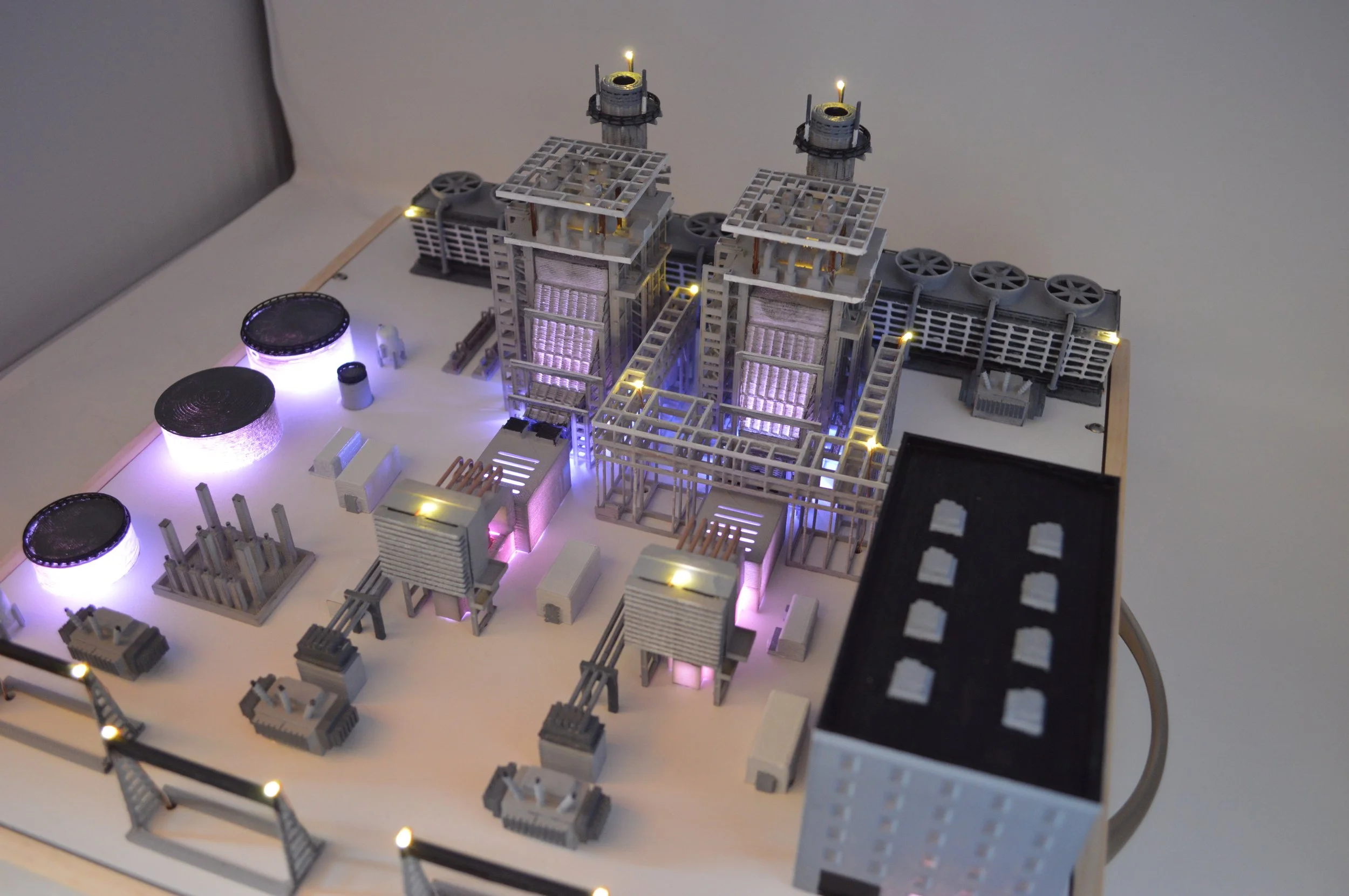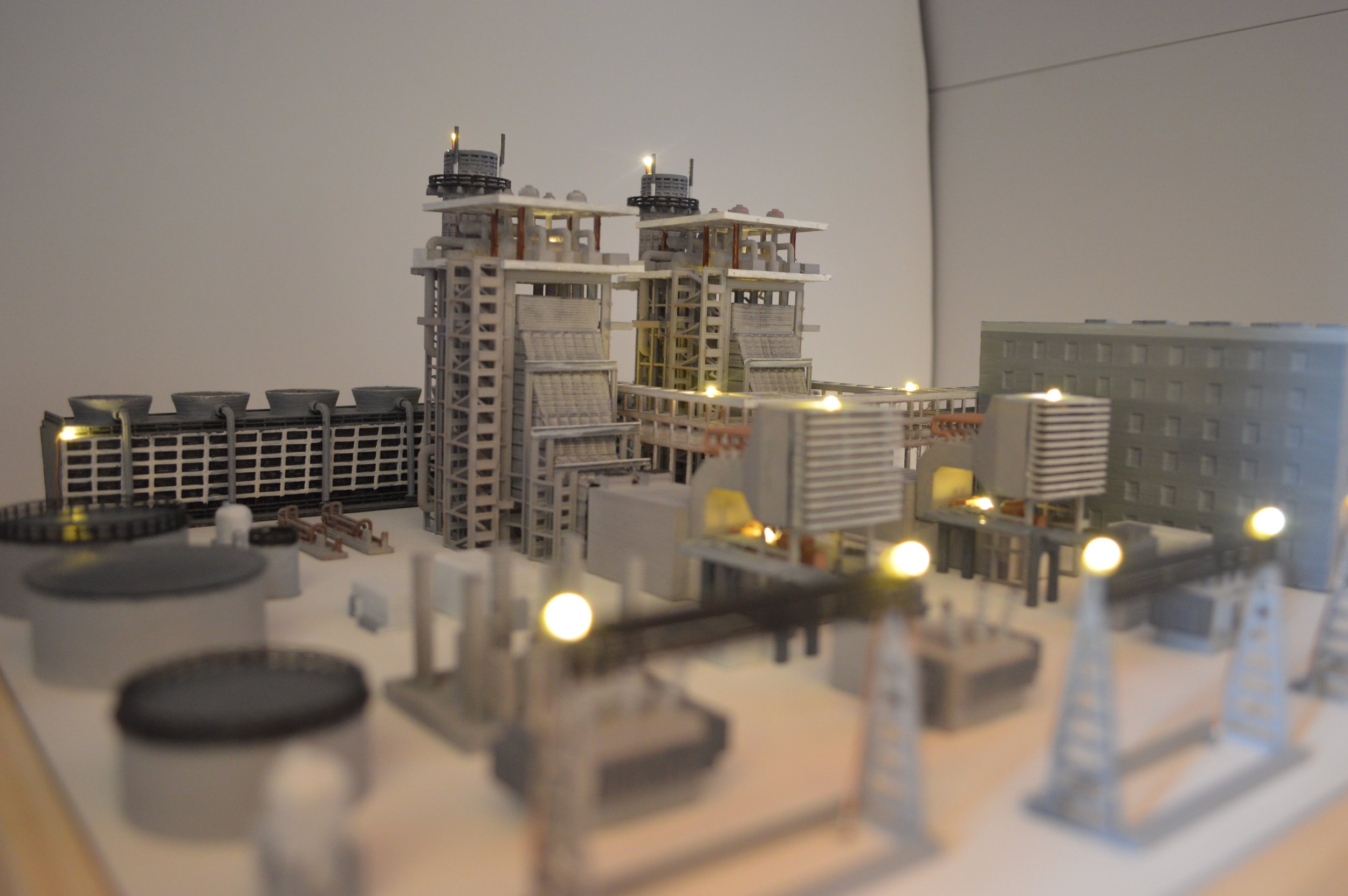 Model was developed to support an energy company campaign to communicate the various new technologies in their facility using lights and audio. The model was created, printed, painted, and the electronics developed.